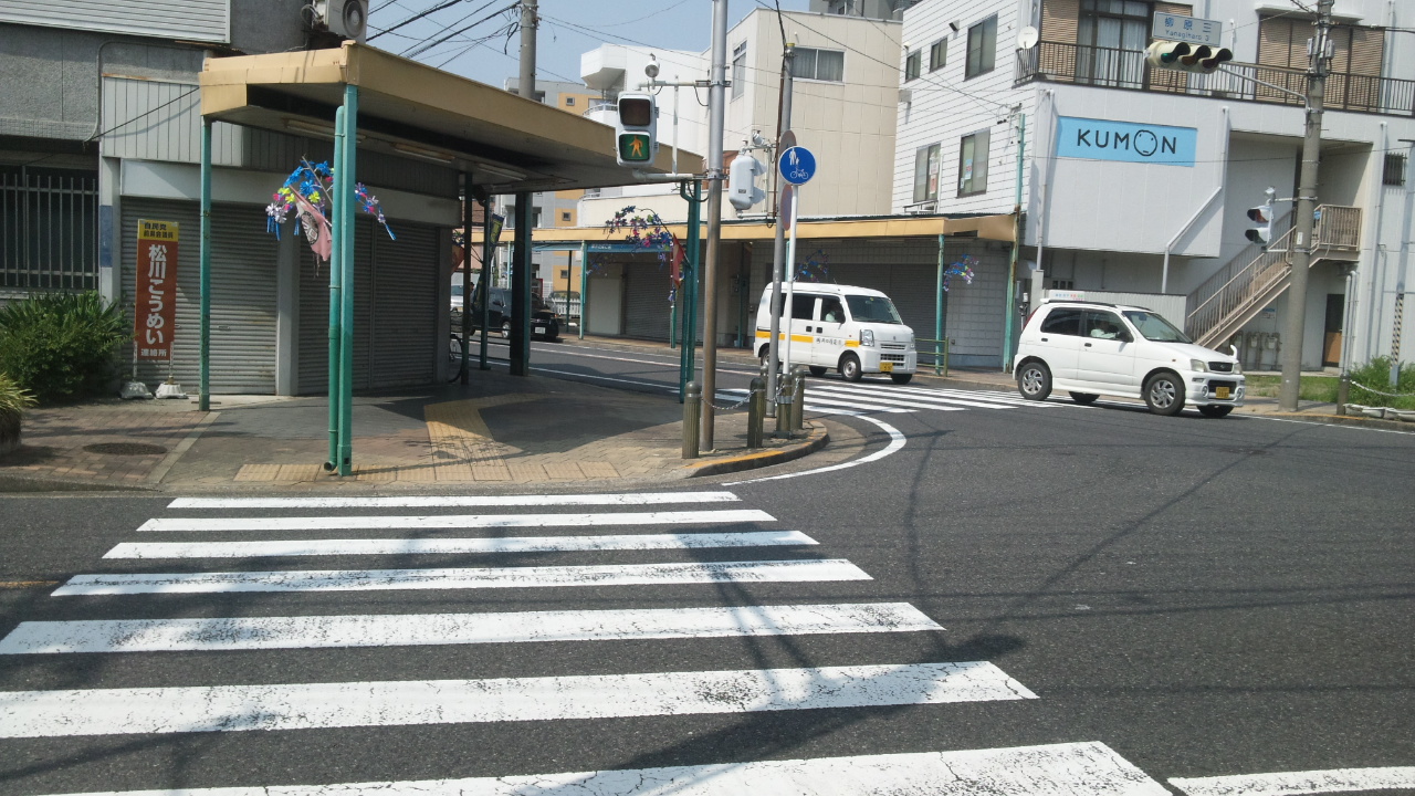 出口を右へ曲がり、青いコインランドリーの看板が見えるまで直進します。