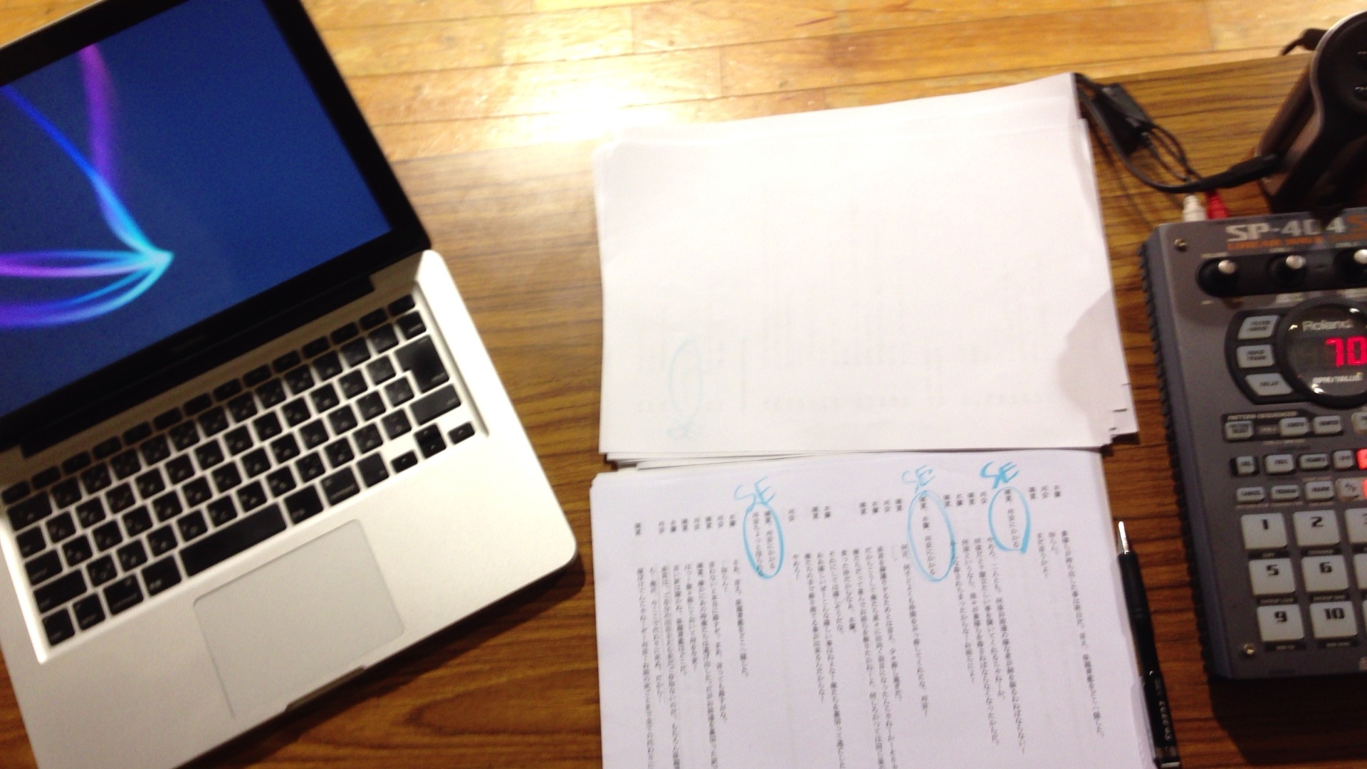 パソコンとサンプラーで音を出しながら台本をチェックしています。