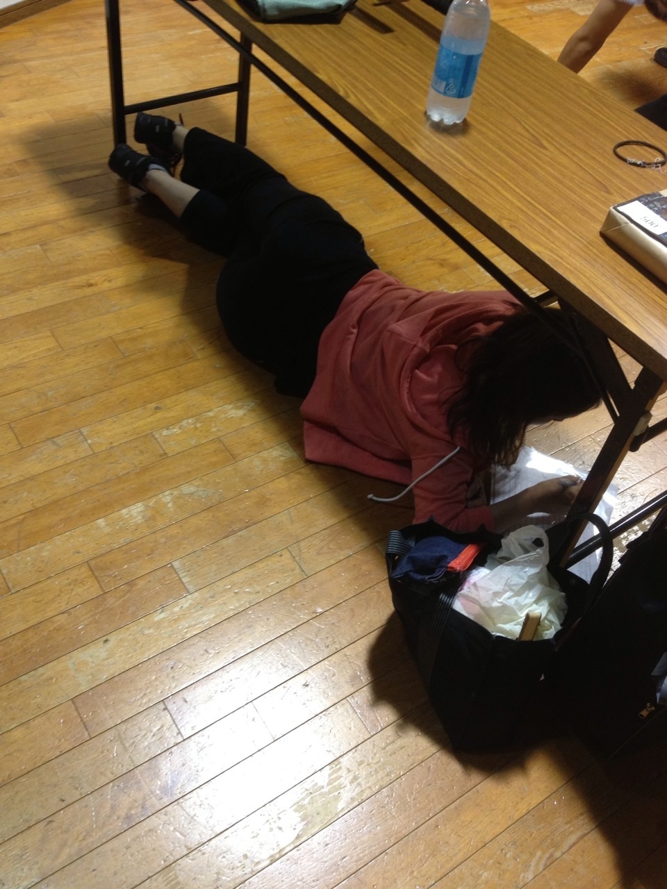 広い稽古場で稽古をする時にはこうして実際のサイズで動いてみたりして本番に近い感覚で稽古したりするんですねー。なるほど。ビニールひもなので見にくいです。うん。