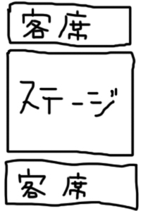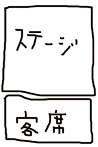 なる予定です。上の方のステージと客席の構成は一般的には「エンドステージ」と言うんですが、両側に客席があるとエンドステージと違ってアッチにもコッチにもお客さんがいることになるので演者はより一層のパフォーマンスが必要になるワケですね、ハイ。